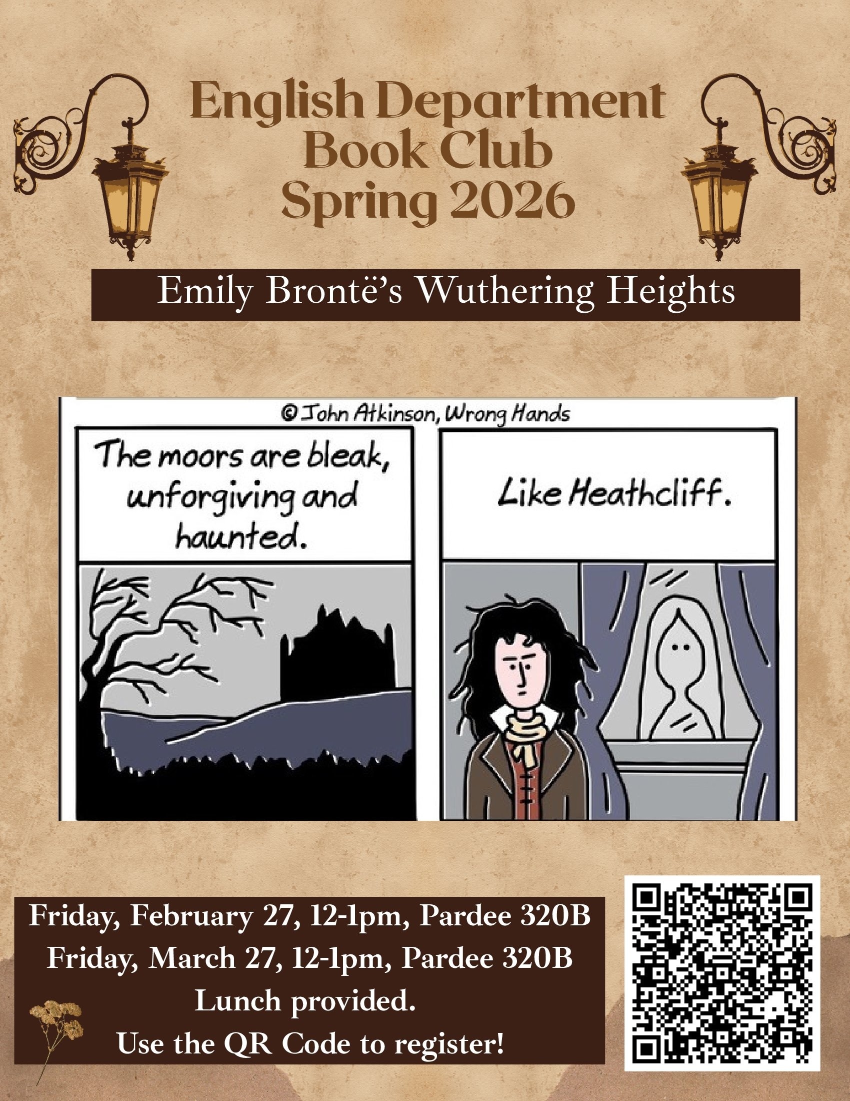 Wuthering Heights by Emily Brontë! We will be meeting two times during the semester on Fridays at noon, February 27 and March 27, with lunch provided. To participate, please fill out this form:
